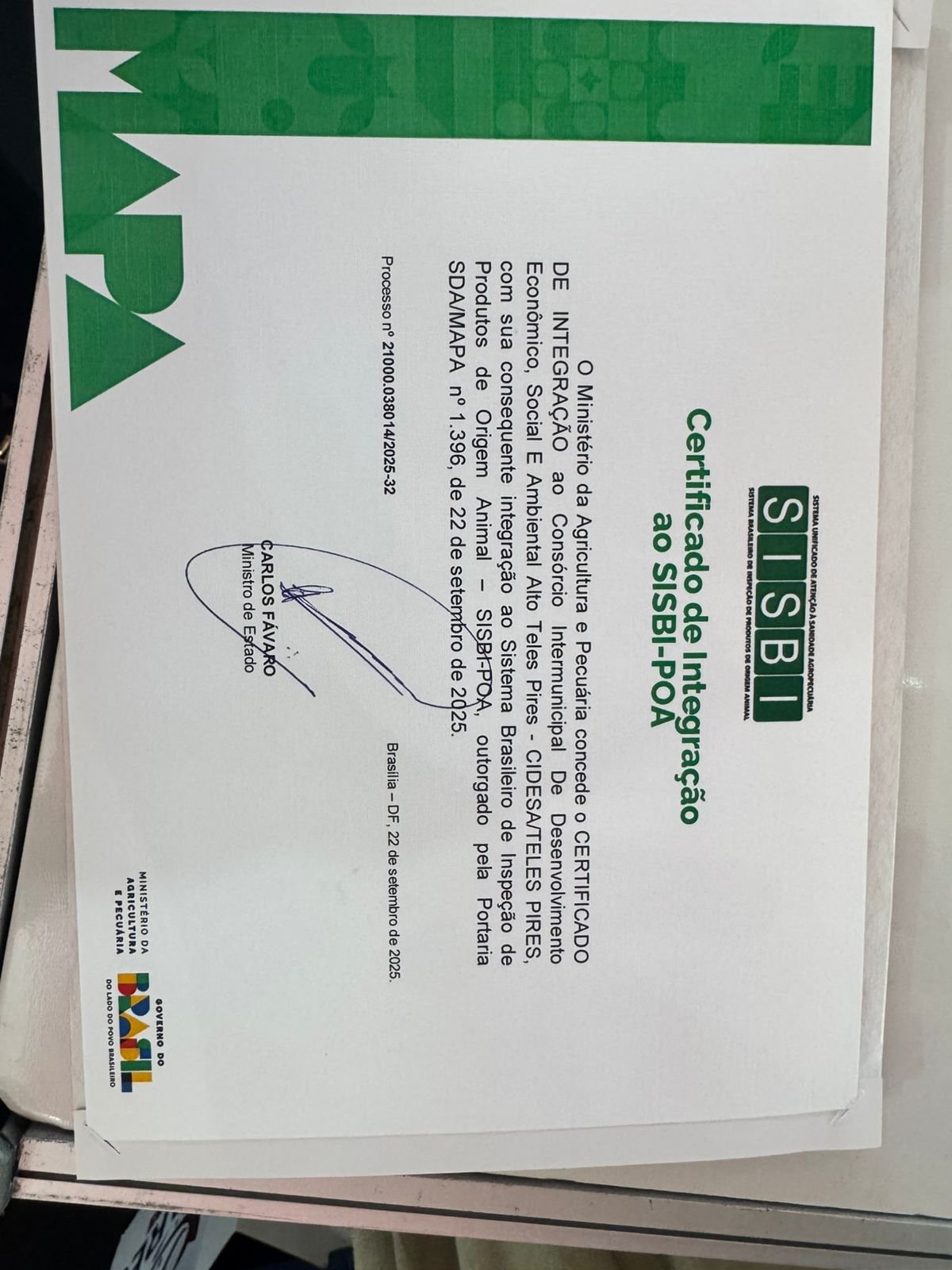 Durante o evento, o Consórcio Teles Pires recebeu a certificação nacional do SISBI-POA, que garante a equivalência dos serviços de inspeção de produtos de origem animal realizados pelo consórcio em relação às exigências do Ministério da Agricultura. Com essa conquista, a empresa Alimentos Catarinense, do empresário Denis Giovanoni, foi oficialmente habilitada a utilizar o Selo SISBI-POA, que reconhece a qualidade de seus produtos e permite a comercialização em todo o território nacional.