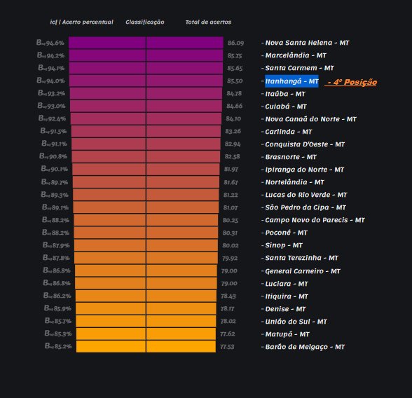 O município de Itanhangá é a 1ª cidade em destaque na micro região e em 4º entre as cidades de Mato Grosso no Ranking da qualidade da informação contábil e fiscal. A iniciativa da Secretaria do Tesouro Nacional foi criada para avaliar a consistência da informação que o Tesouro recebe por meio do Sistema de Informações Contábeis e Fiscais do Setor Público Brasileiro (Siconfi) e consequentemente, disponibiliza para acesso público.