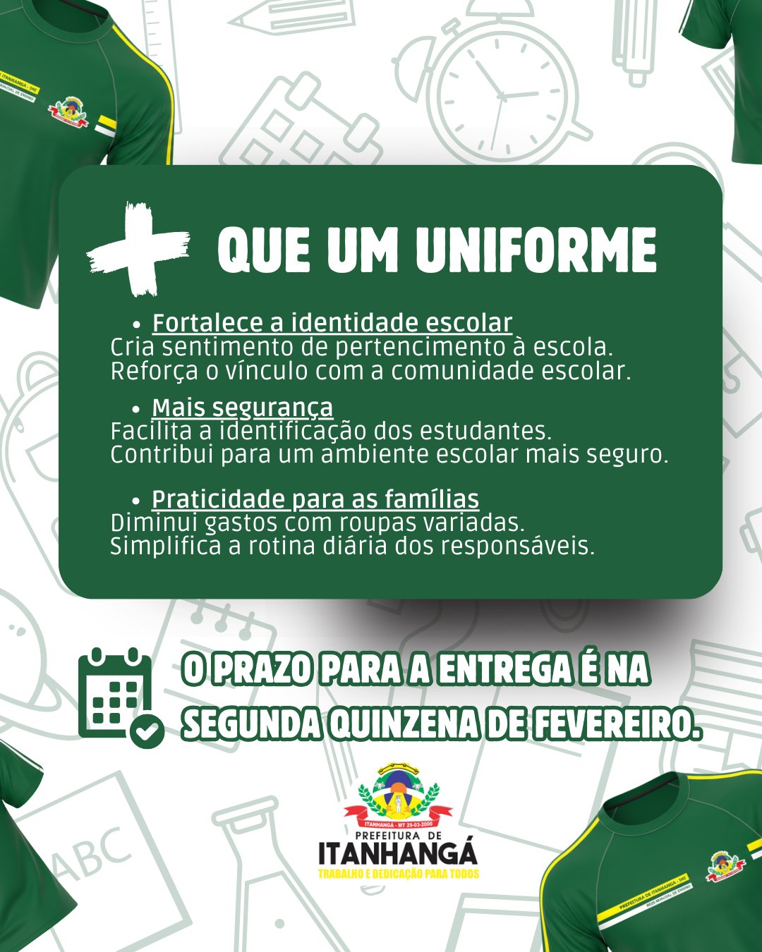 A entrega está prevista para a segunda quinzena de fevereiro, garantindo que os estudantes já estejam preparados logo no início das atividades letivas. Além de promover conforto e identificação dos alunos, o uniforme escolar também representa um importante apoio às famílias, reduzindo gastos com vestuário e assegurando que todas as crianças tenham as mesmas condições, fortalecendo a igualdade e o sentimento de pertencimento no espaço escolar. Para a Administração Municipal, investir em educação vai além da sala de aula. Significa cuidar dos detalhes que fazem a diferença no dia a dia dos estudantes, oferecendo estrutura, acolhimento e dignidade para que possam aprender, se desenvolver e construir um futuro melhor. A ação reforça o compromisso contínuo da Prefeitura Municipal de Itanhangá com políticas públicas que valorizam as crianças, apoiam as famílias e fortalecem a educação como base do desenvolvimento do município. Porque investir em uniforme escolar é investir em igualdade, conforto e mais dignidade para nossas crianças.