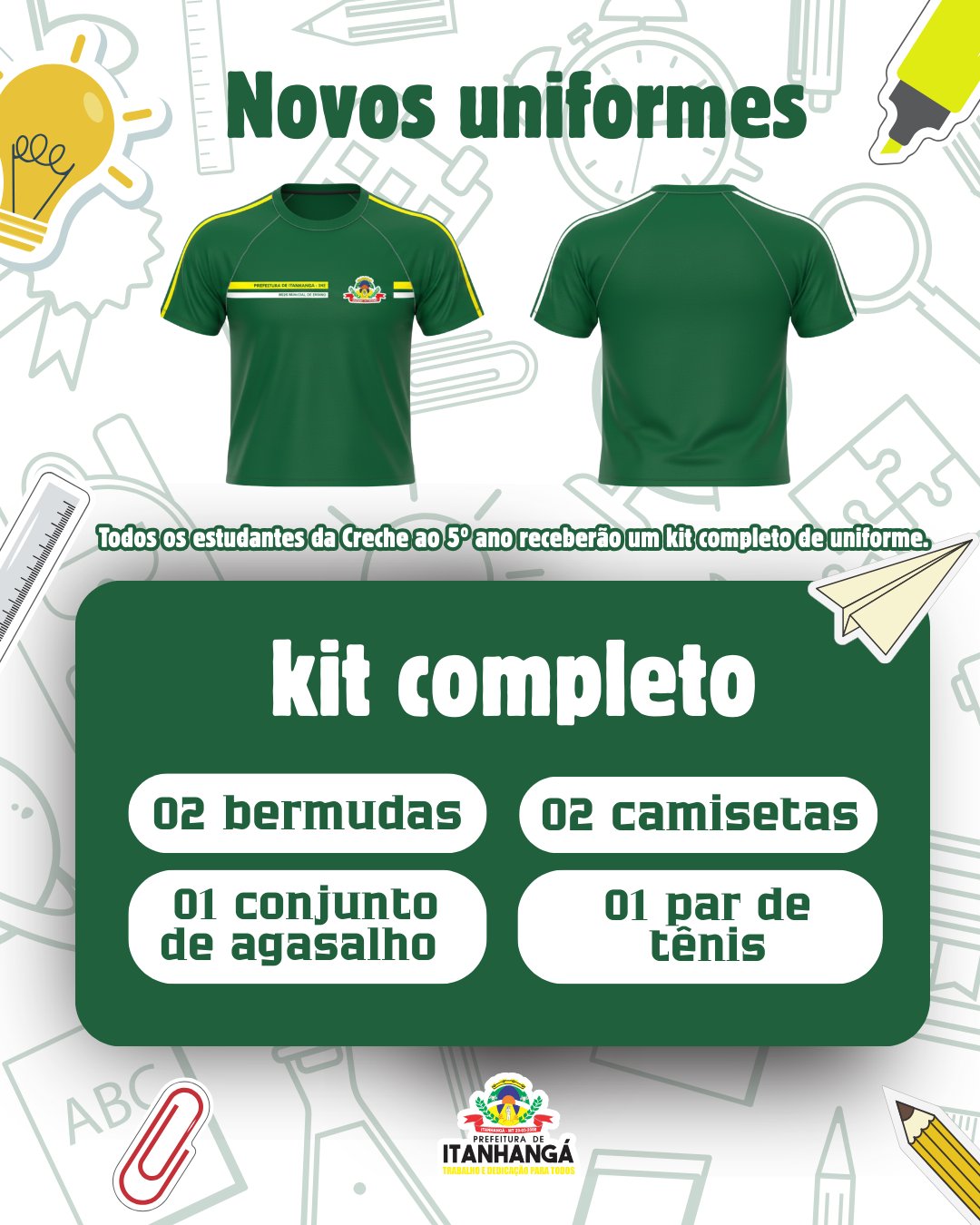 A Prefeitura Municipal de Itanhangá reafirma seu compromisso com a educação pública de qualidade e com o bem-estar dos estudantes da rede municipal ao anunciar a entrega do kit completo de uniforme escolar gratuito para o ano letivo de 2026. A iniciativa atenderá todos os alunos da Creche ao 5º ano, garantindo que cada criança inicie o período escolar com vestuário adequado, confortável e padronizado, contribuindo para mais segurança, praticidade e igualdade no ambiente educacional. O kit foi cuidadosamente planejado para acompanhar a rotina dos estudantes ao longo de todo o ano, oferecendo resistência, durabilidade e proteção em diferentes condições climáticas. Cada aluno receberá: